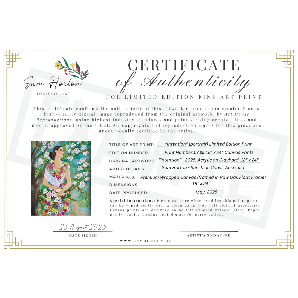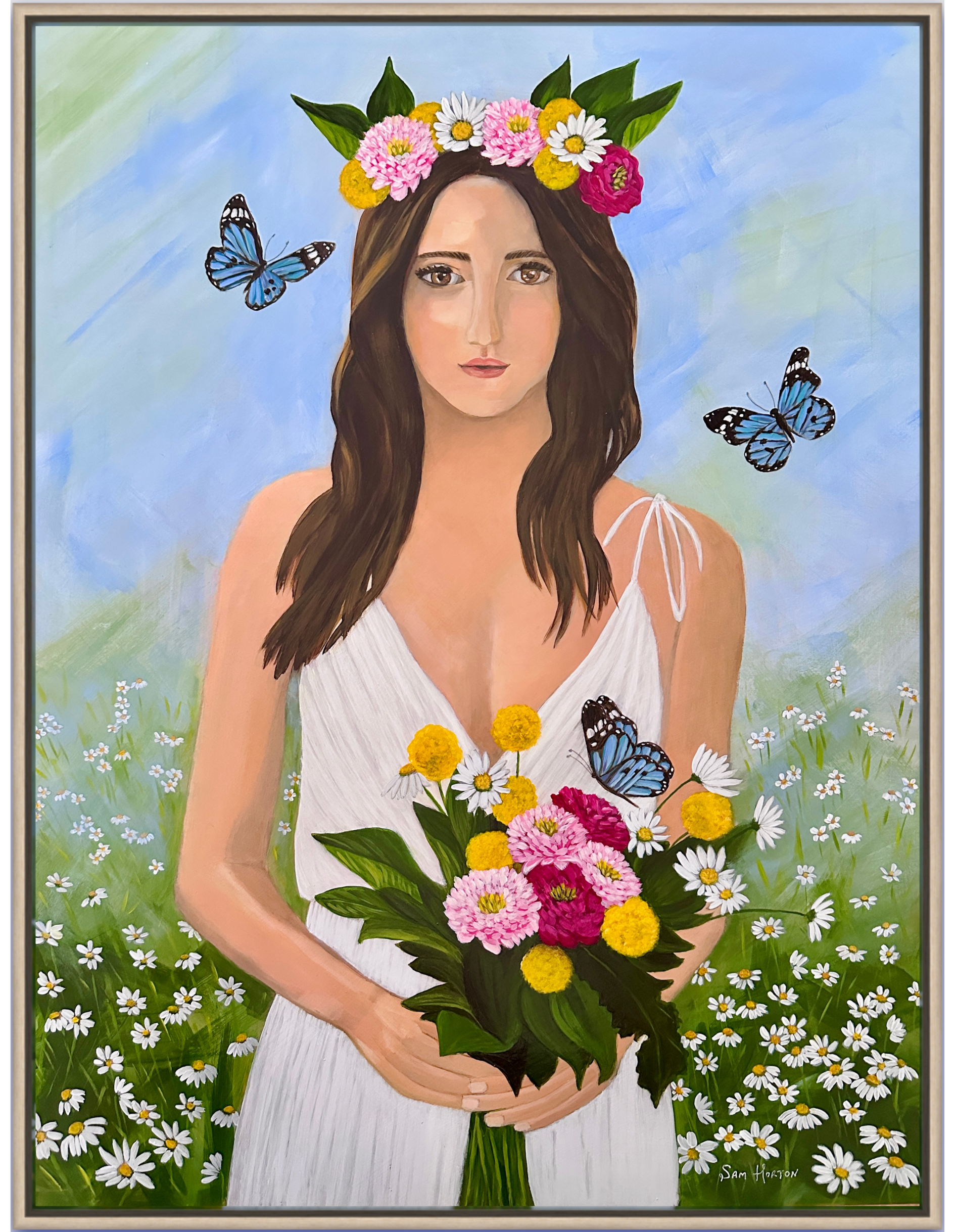 “Self Love” piece was born from a deep desire to honour the journey of coming home to oneself. I wanted to capture the energy of renewal, grace, and feminine strength that arises when we stop looking outside for validation and instead bloom from within. Surrounded by symbols of nature’s wisdom — butterflies, wildflowers, and soft light — she embodies the gentle courage it takes to nurture your own heart. She stands rooted in her truth, with eyes wide open and heart quietly radiant.
